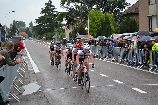 In de voorlaatste ronde heeft Peter nog 2 keer geprobeerd weg te rijden maar zonder succes. We gingen dus met een kopgroep van 9 de laatste ronde in met een 15 tal seconden voorsprong, op het smalle baantje zat ik heel de tijd op kop, vragend aan de man achter mij om over te nemen reden we op den duur nog maar 30km/h ik keek wat verder achterom en zag Peter teken doen om toch te rijden, dus dan toch terug versnelt, maar met het idee nog wat over te houden de laatste kilometers. Bij het opdraaien van de laatste “rechte” lijn reed ik nog steeds op kop, met nog 2 km te gaan gierden de zenuwen en adrenaline door mijn lijf. Op het natte wegdek schoof mijn achterwiel weg, gelukkig kon ik nog relatief gemakkelijk recht blijven. Dit zorgde er echter wel voor dat mijn lichaam ondertussen tot achter mijn oren vol zat met adrenaline. Ik keek achterom en zag dat ik een 10 tal meter voor de groep uit reed, met “mijn domme kloten” ging ik vol aan in de hoop weg te blijven, dit was natuurlijk valse hoop wat op 1000m voor het einde duidelijk werd, de adrenaline had intussen plaats gemaakt voor verzuring.